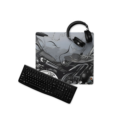 Introducing the "CyberNexus Gaming Mouse Mat" - a striking and edgy mouse mat that blends the industrial charm of a mechanic's workshop with the visionary essence of a futuristic art style. This one-of-a-kind, monochromatic design is perfect for gamers who appreciate a daring and artistic aesthetic.