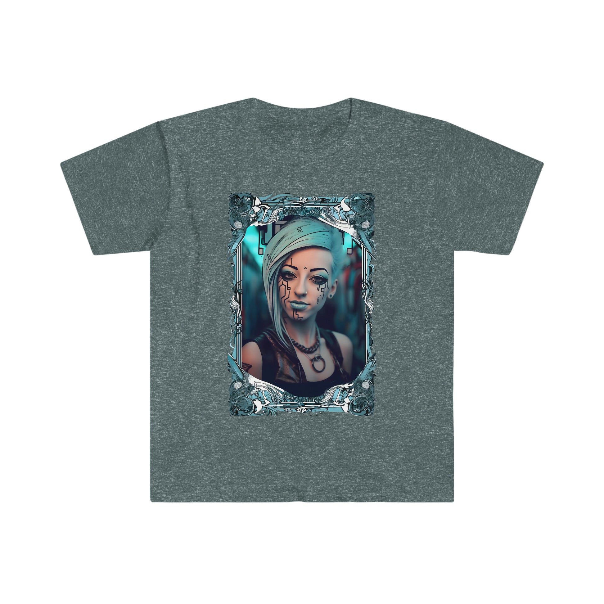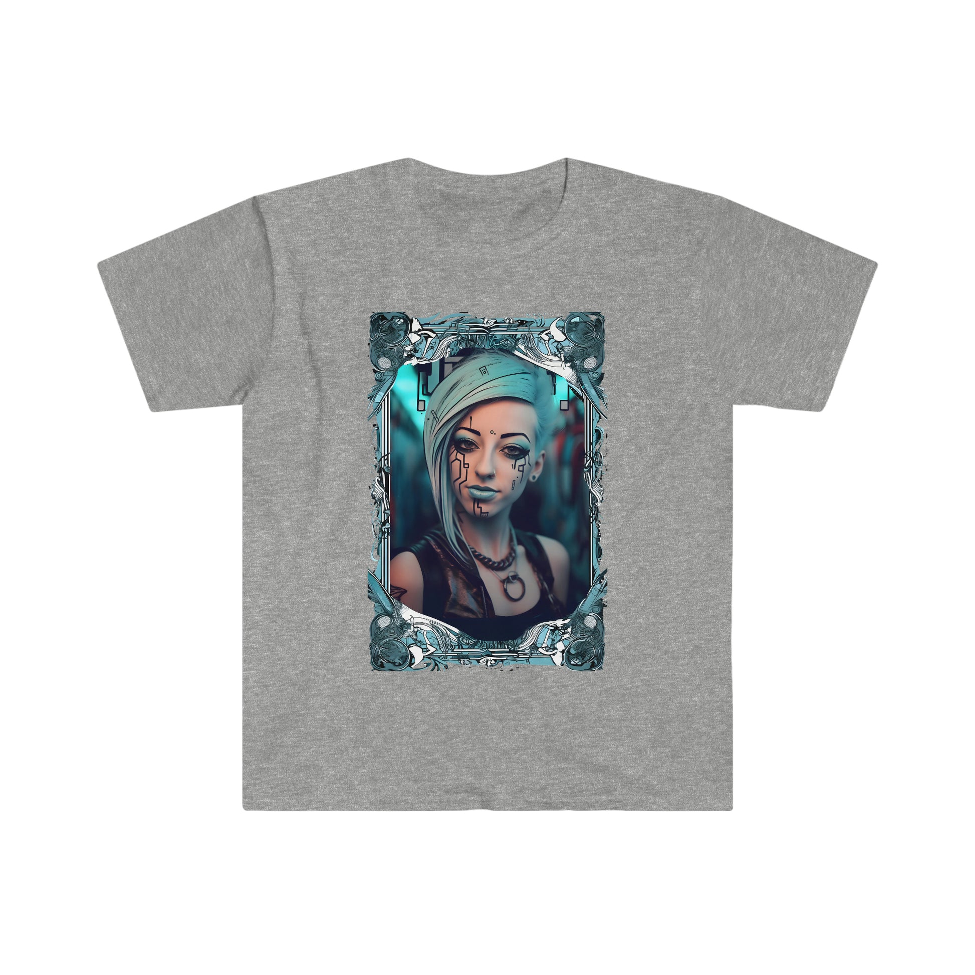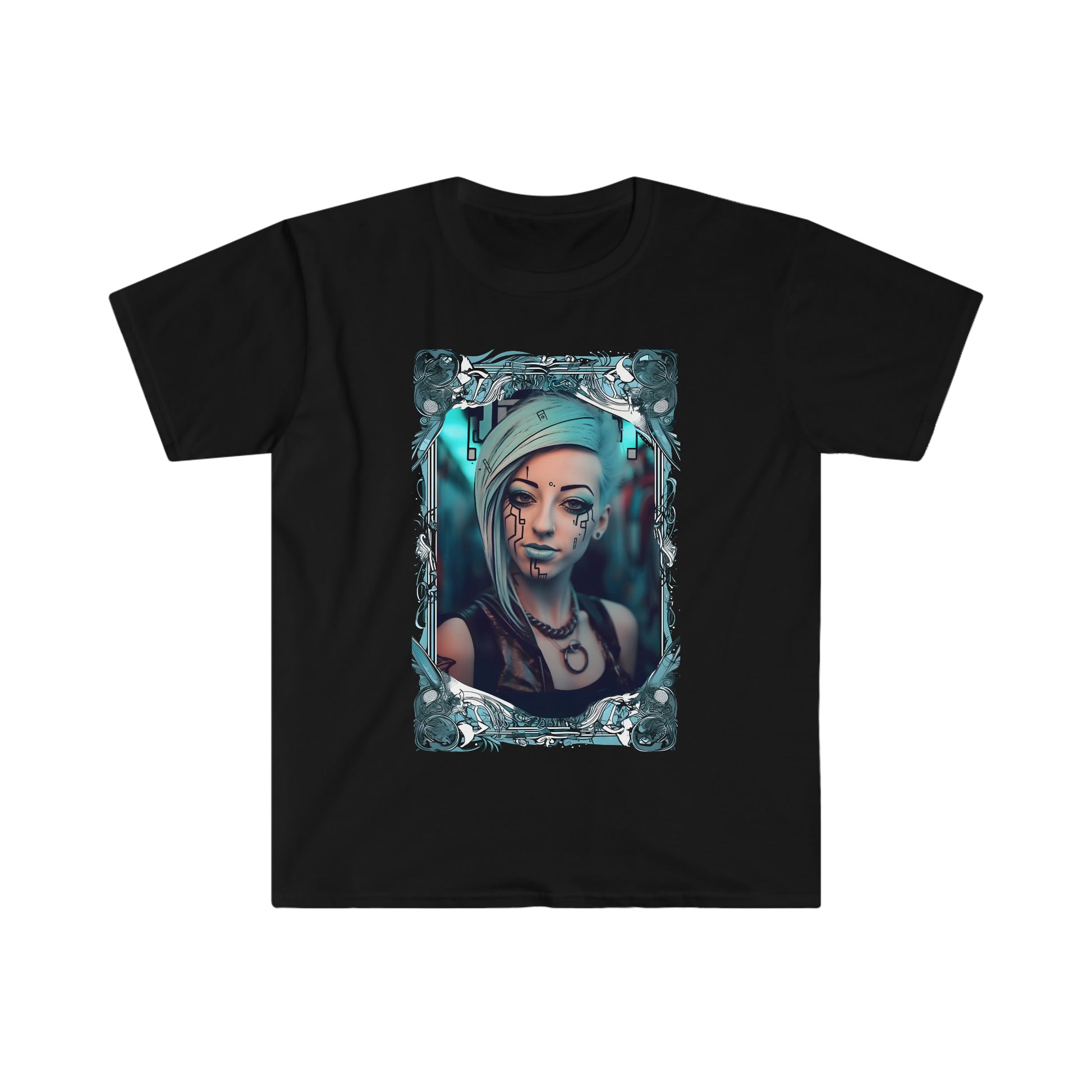 The Tshirt featuring our promo girl Nyx as The High Priestess is a stunning representation of this iconic Tarot card. Nyx is depicted in a regal and ethereal manner, evoking the mysteries of the High Priestess and the power she represents. The artwork features intricate details and a fantastical color palette, showcasing blue, purple, and gold tones, all of which come together to form a stunning image in a cyberpunk cartoon mambo graffiti theme. This Tshirt is sure to become a conversation starter wherever it is worn, with its striking imagery and captivating portrayal of Nyx as the embodiment of The High Priestess.