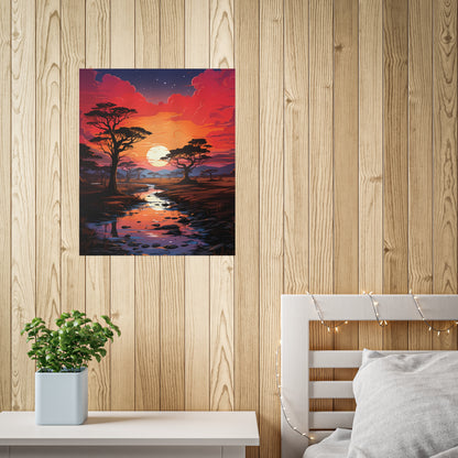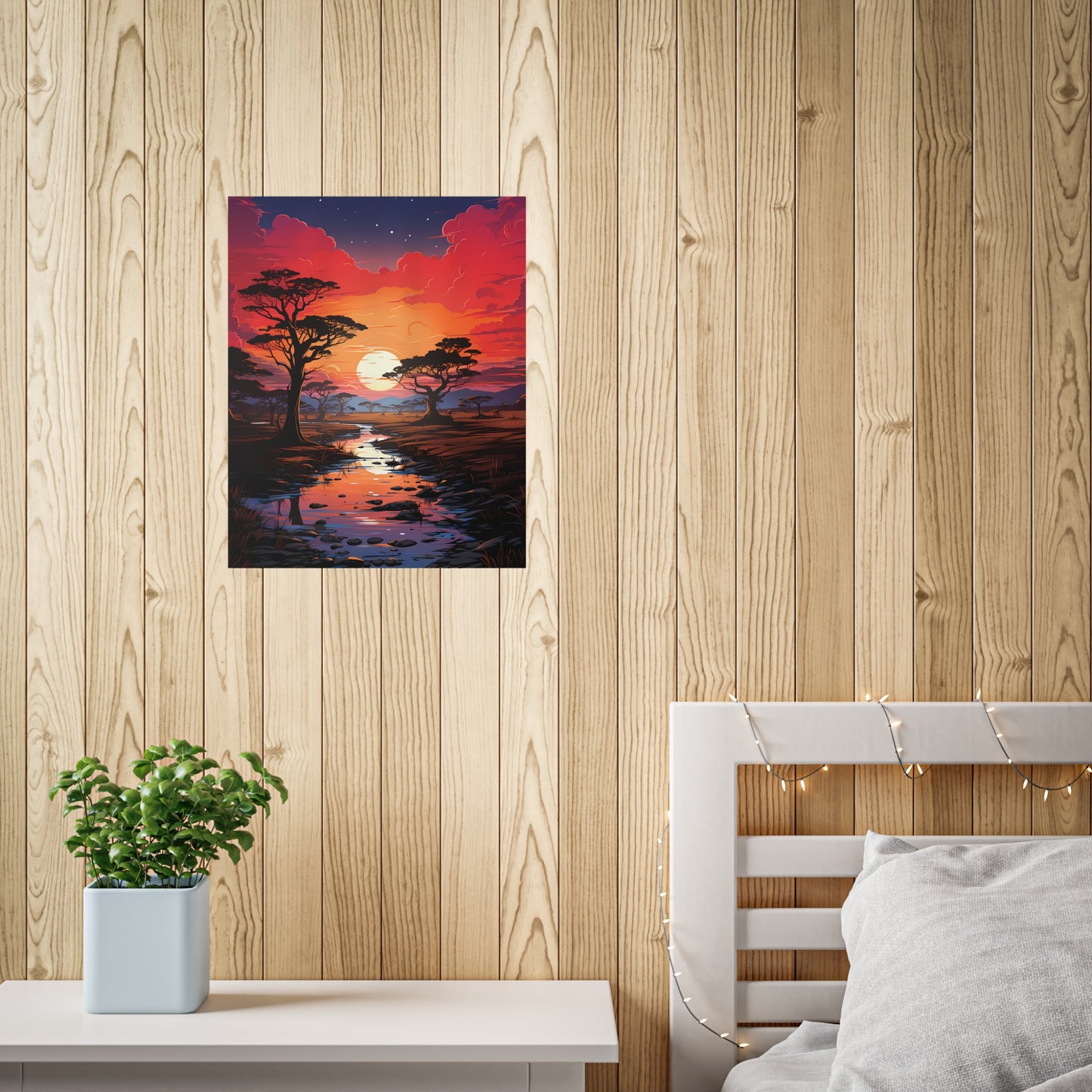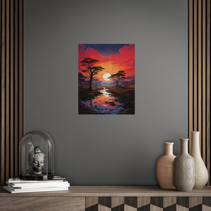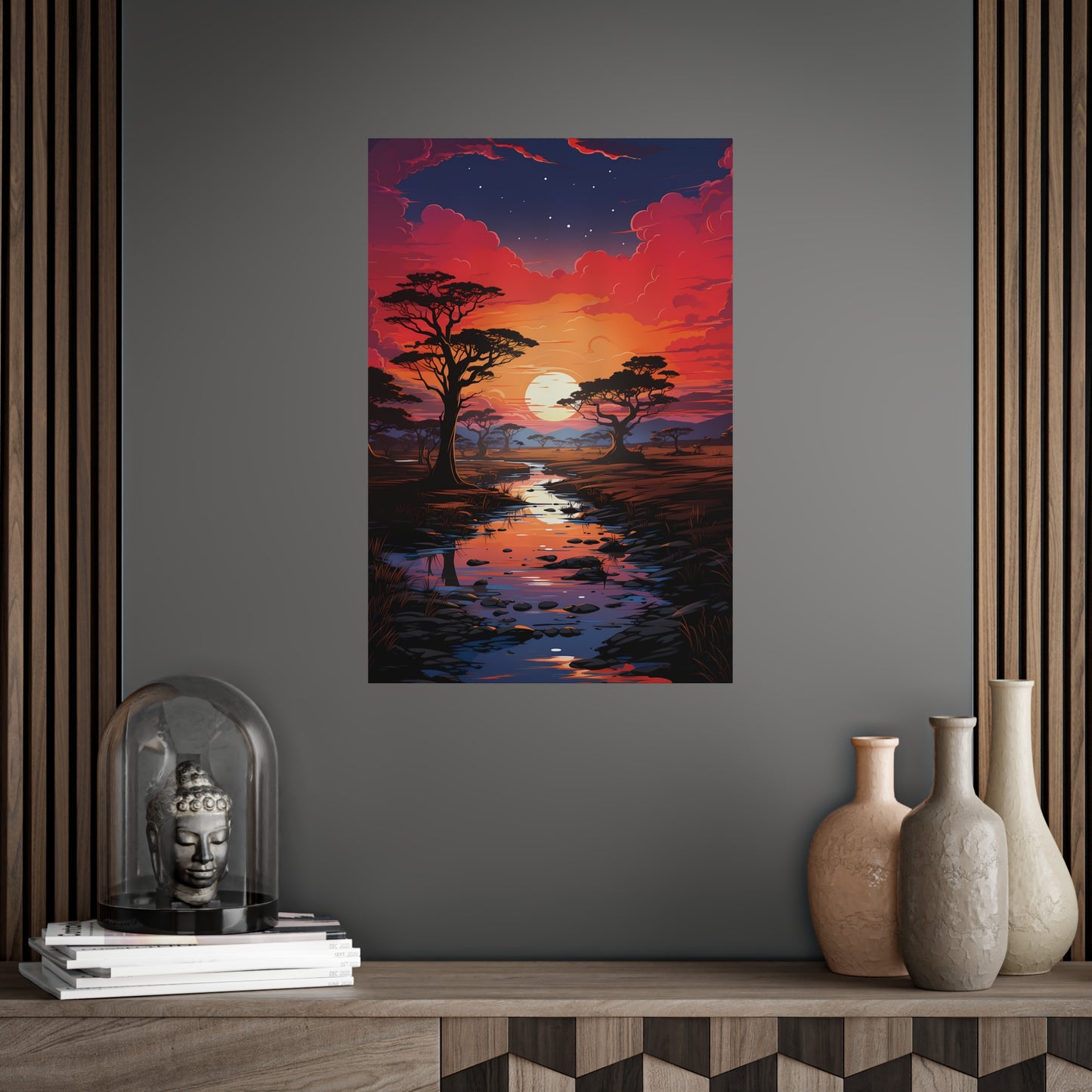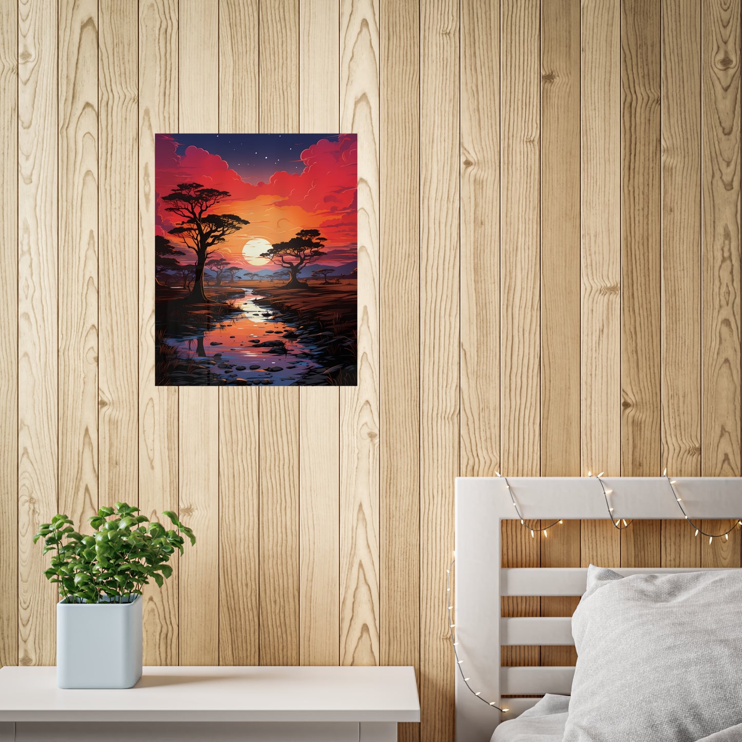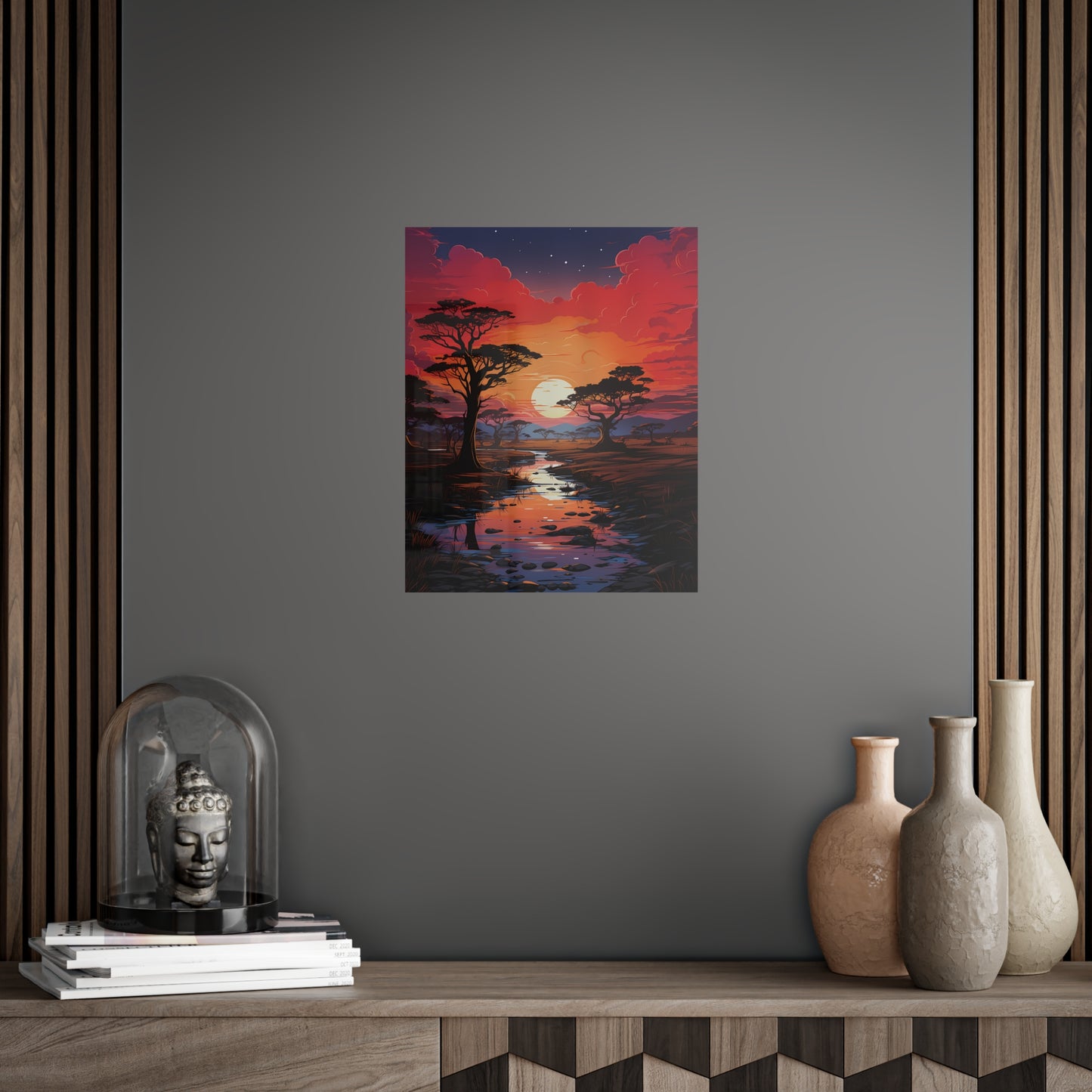 "Safari Sunset" is a mesmerizing digital masterpiece that transports viewers to the heart of the African savannah at the enchanting moment when the sun bids farewell to the day. The rich, warm palette bathes the landscape in soft, golden hues, casting dramatic shadows across the vast savannah. Silhouetted acacia trees and meticulously detailed wildlife add an element of grandeur and timelessness to the scene. As the sun dips below the horizon, the sky ignites with fiery oranges, deep purples, and soft pinks, creating a breathtaking tableau that captures the essence of the African wilderness. This artwork invites viewers to immerse themselves in the serene beauty of the savannah, celebrating both its awe-inspiring landscapes and the urgency of preserving these precious ecosystems for future generations.