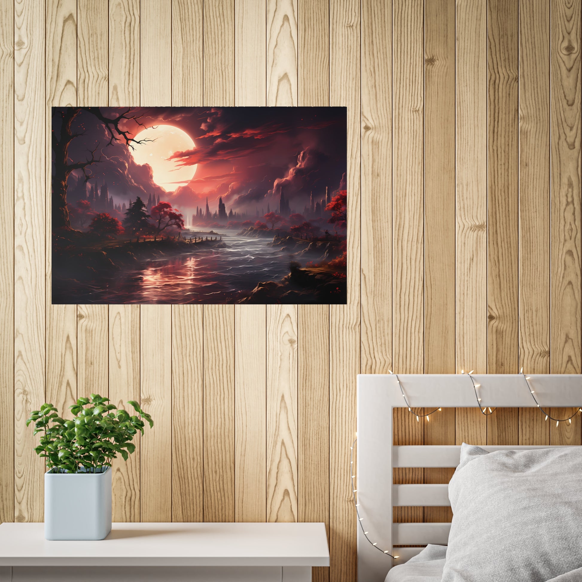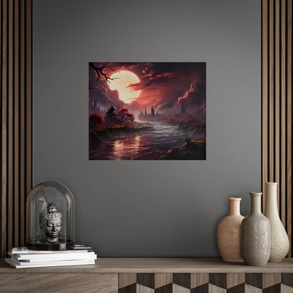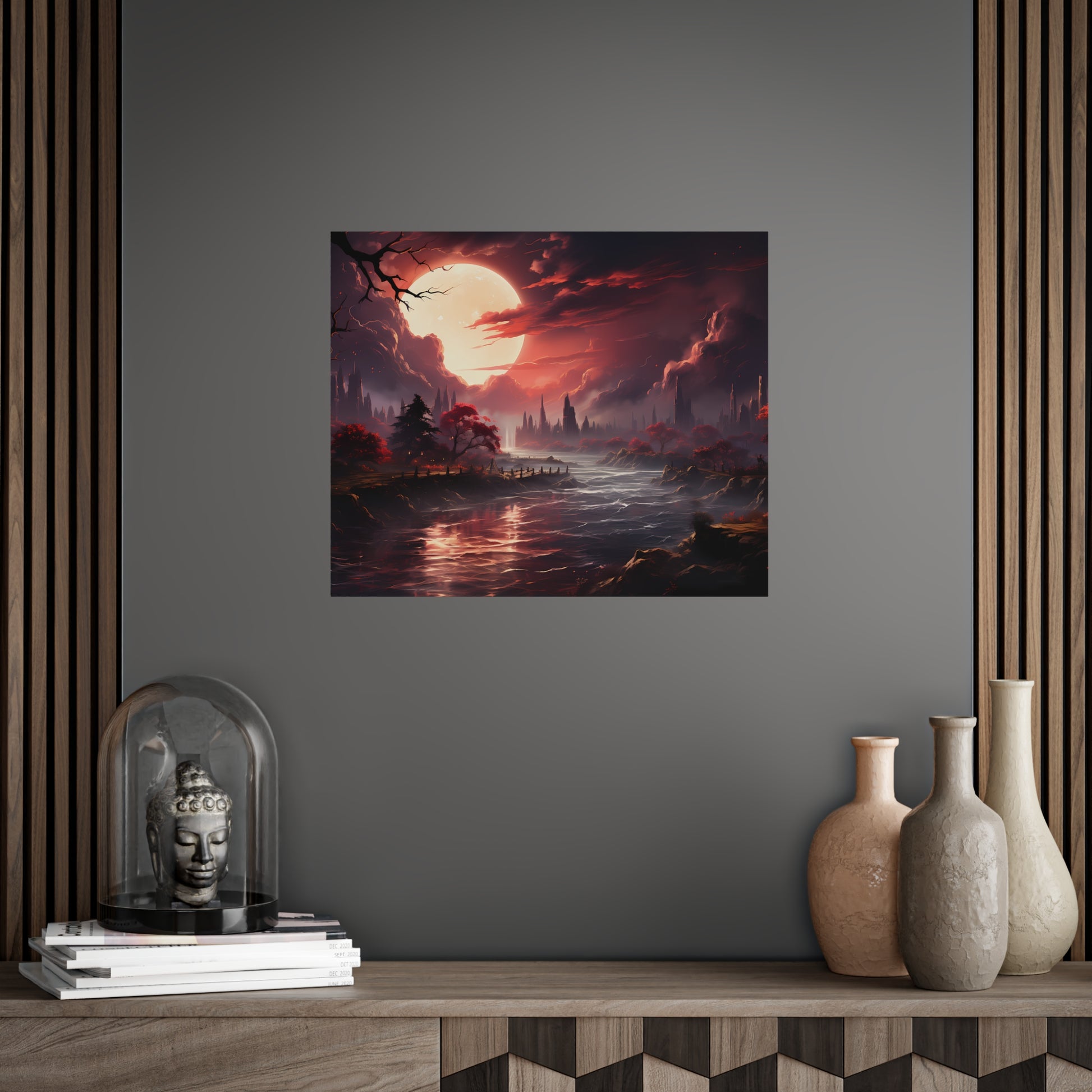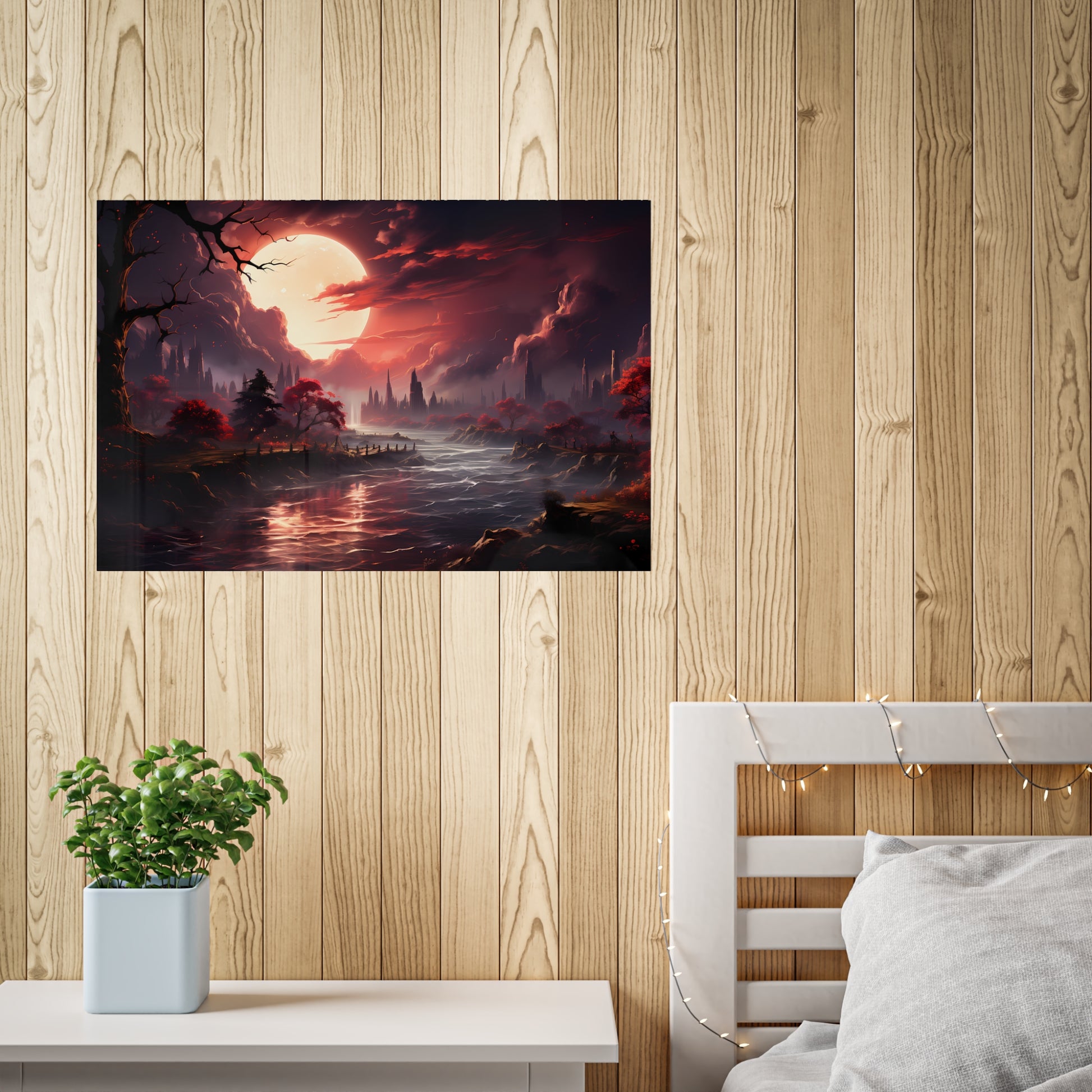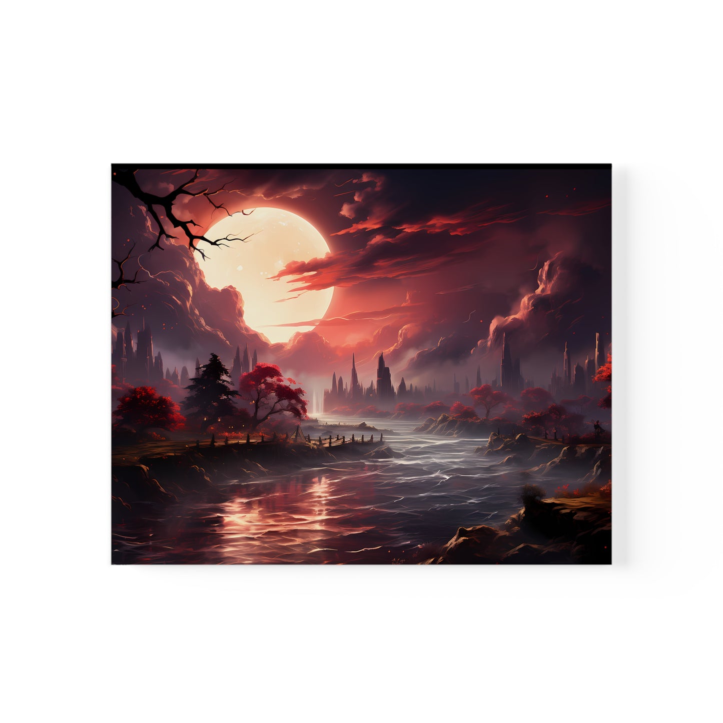 "Vermilion Reflection" transports the viewer into a mesmerizing realm where the vivid contrasts of a gothic fantasy world meld seamlessly with the tranquility of traditional landscapes. Bathed in the sultry glow of a full moon, the atmospheric cityscape casts its reflection onto the black and red river below, painting a picture of richly colored skies and unspoken mystique. Drawing inspiration from the enchanting styles of Artgerm and atmospheric cityscapes, this breathtaking piece invites the beholder to lose themselves in the enigmatic allure of its moonlit scene. As the eye lingers on the haunting beauty of the vermilion-tinted waters, the artwork captures the essence of serenity entwined with the shadows of the night.