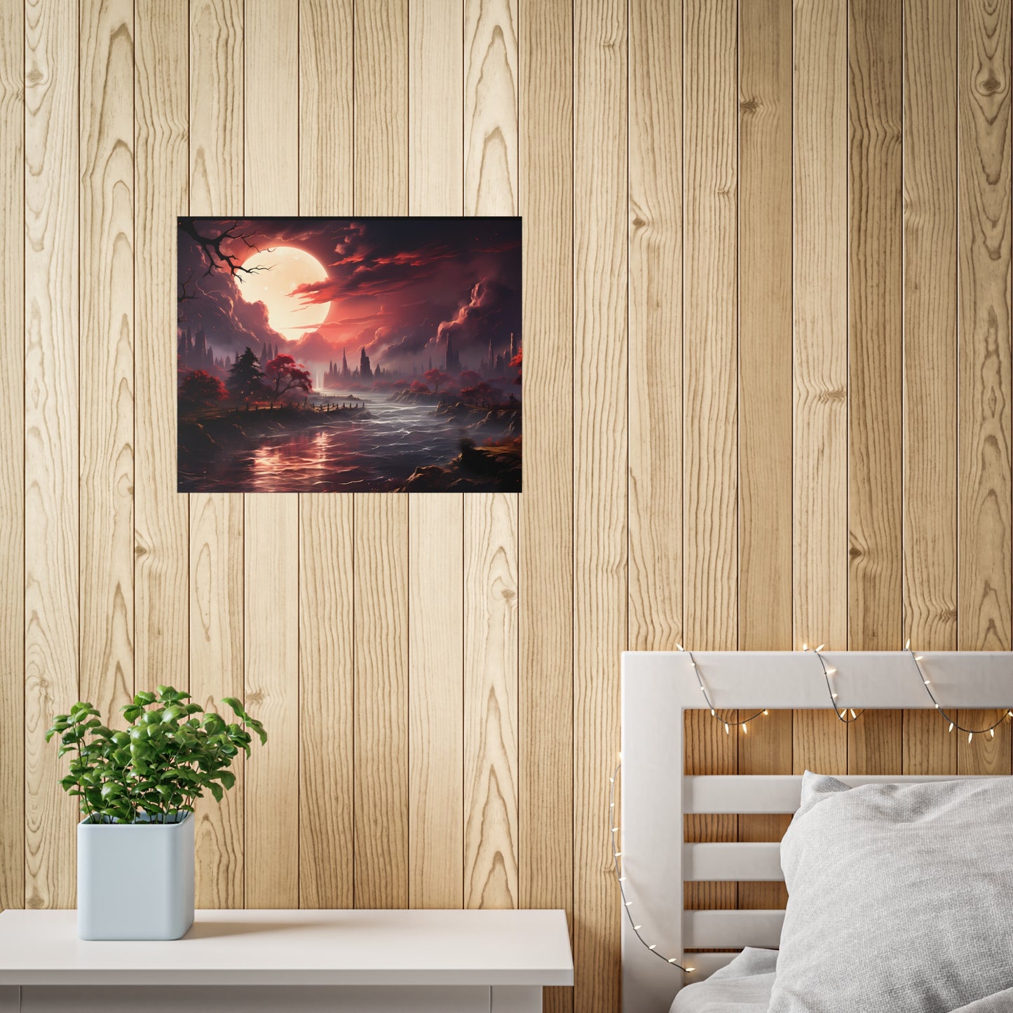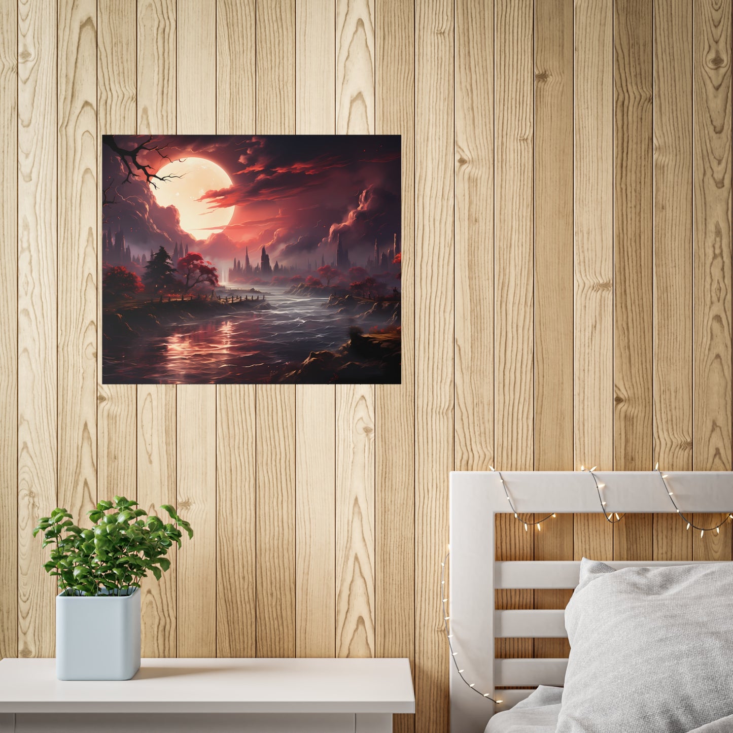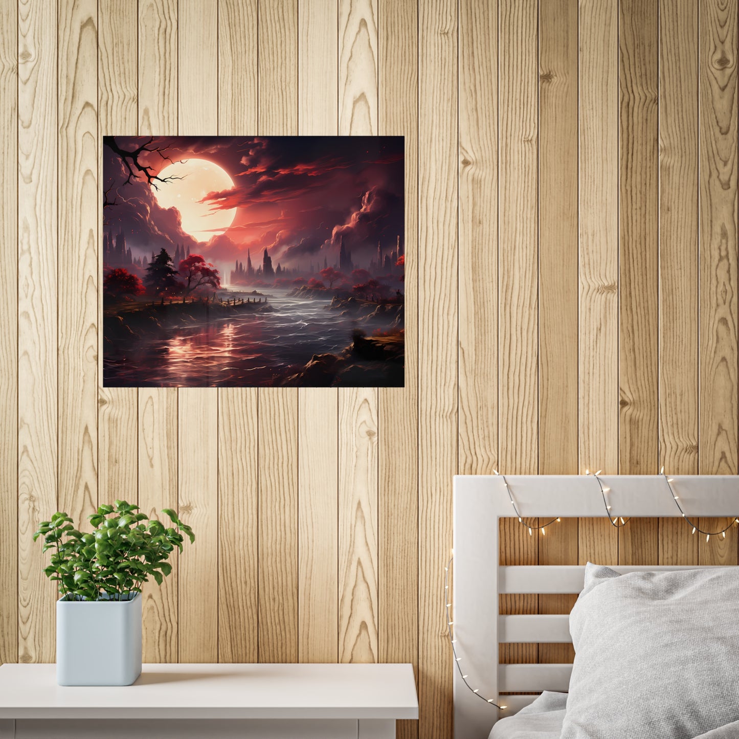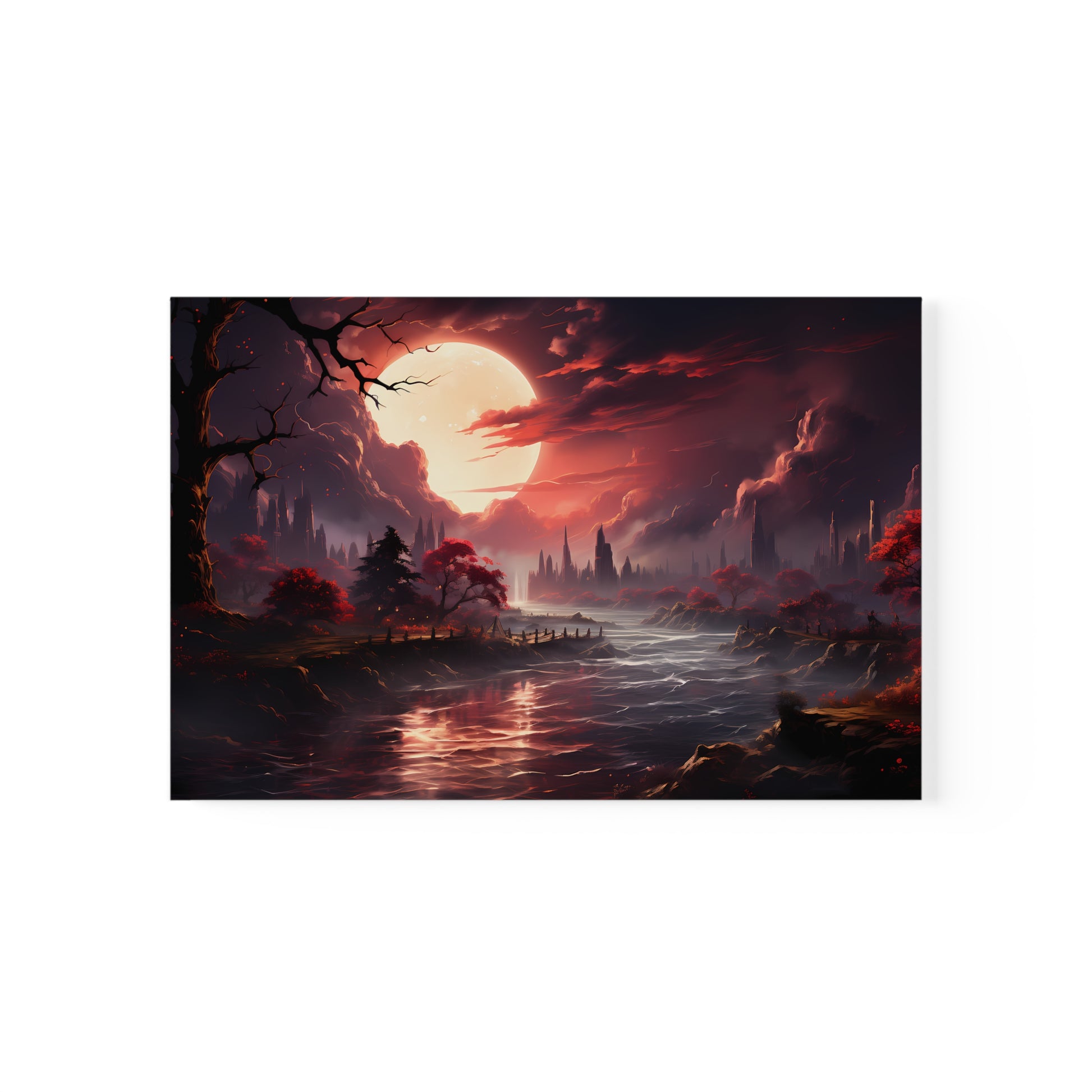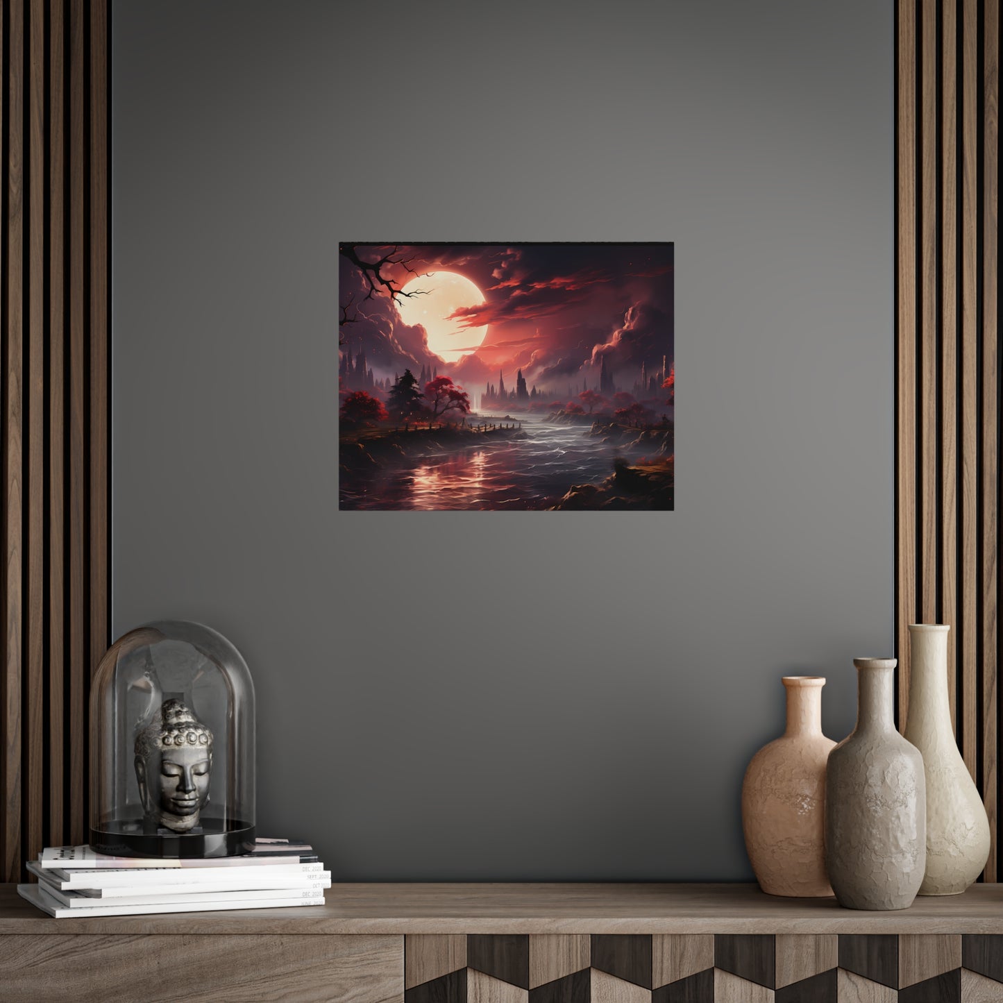 "Vermilion Reflection" transports the viewer into a mesmerizing realm where the vivid contrasts of a gothic fantasy world meld seamlessly with the tranquility of traditional landscapes. Bathed in the sultry glow of a full moon, the atmospheric cityscape casts its reflection onto the black and red river below, painting a picture of richly colored skies and unspoken mystique. Drawing inspiration from the enchanting styles of Artgerm and atmospheric cityscapes, this breathtaking piece invites the beholder to lose themselves in the enigmatic allure of its moonlit scene. As the eye lingers on the haunting beauty of the vermilion-tinted waters, the artwork captures the essence of serenity entwined with the shadows of the night.